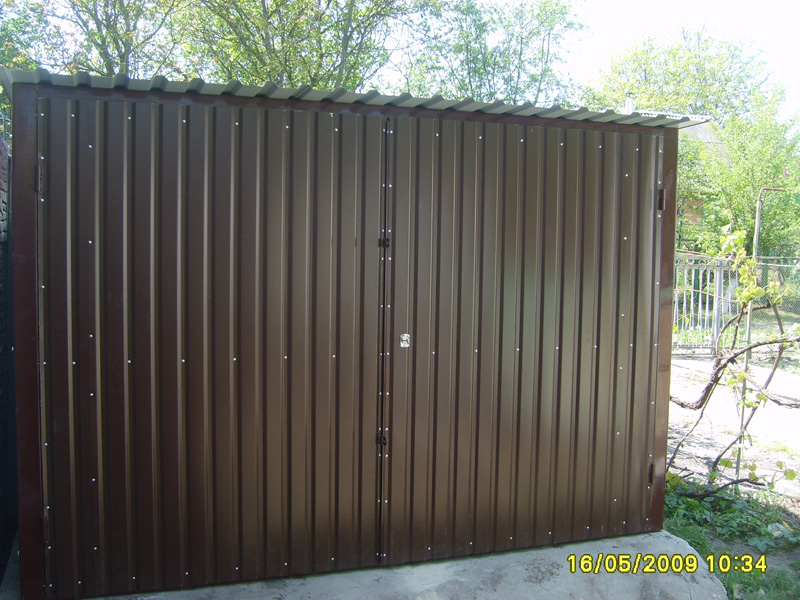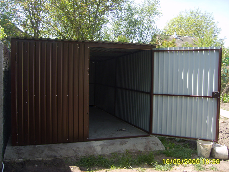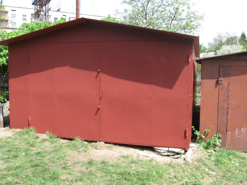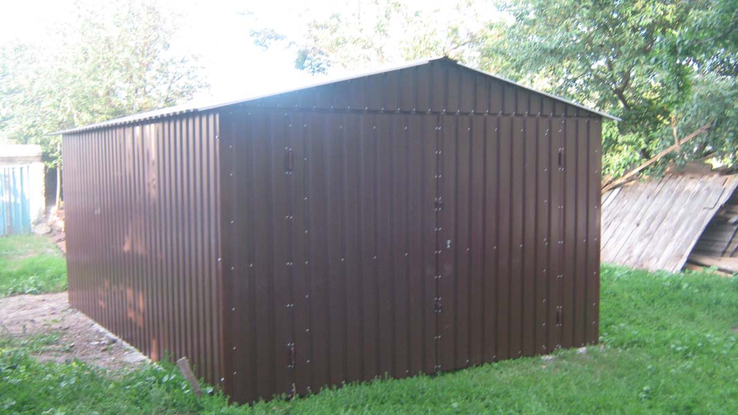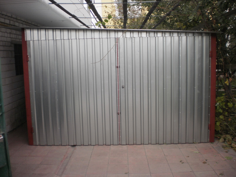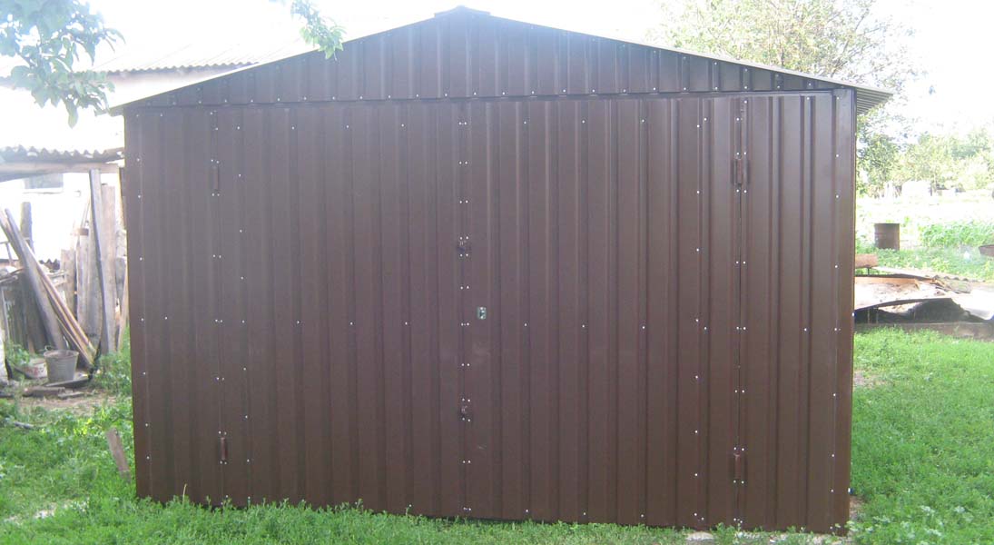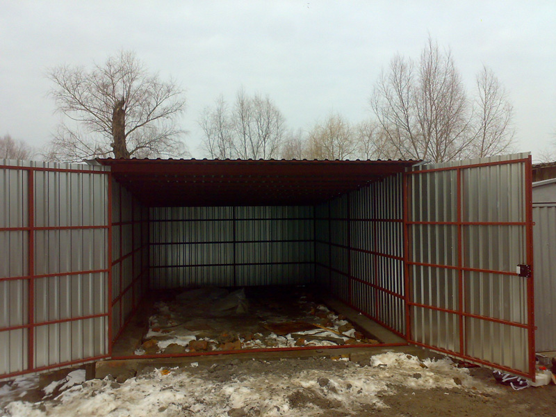 Предлагаем Вашему вниманию металлические гаражи. Каркас гаража изготовлен из квадратных и прямоугольных труб 40×20 и 30×30, рама ворот изготовлена из швеллера 100×50×3, что придает конструкции гаража дополнительную жесткость и исключает перекос створок ворот в будущем. Воротные створки крепятся к раме с помощью воротных петель 22×120 с шариком. Для крыши используются квадратные трубы 40×40.