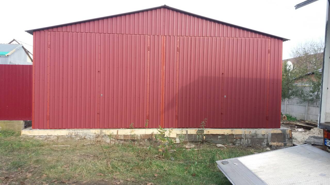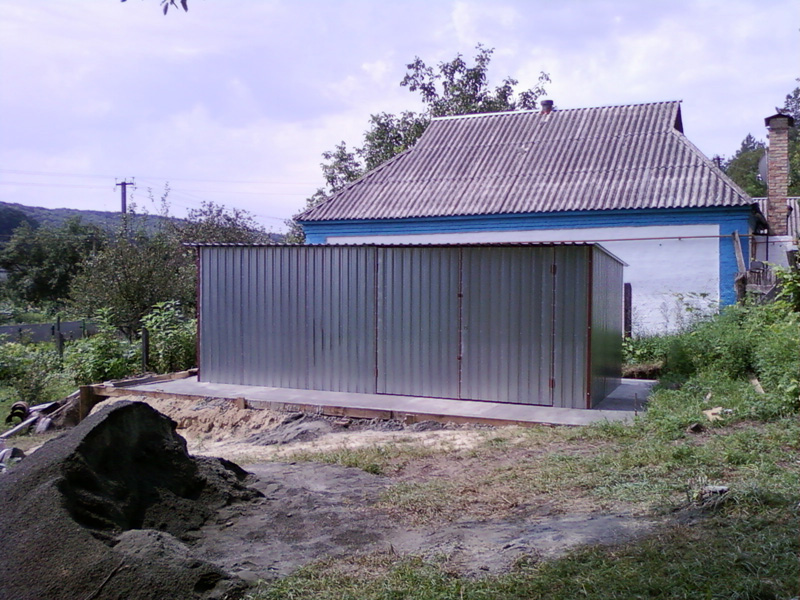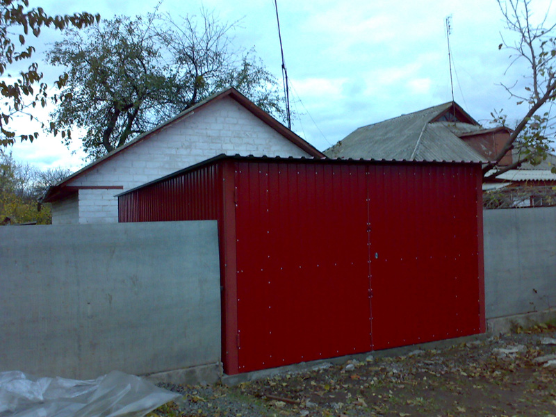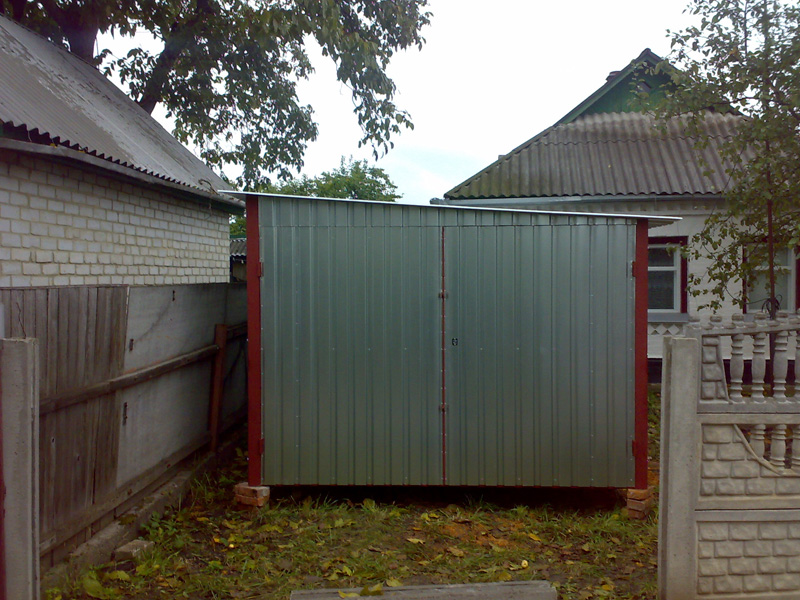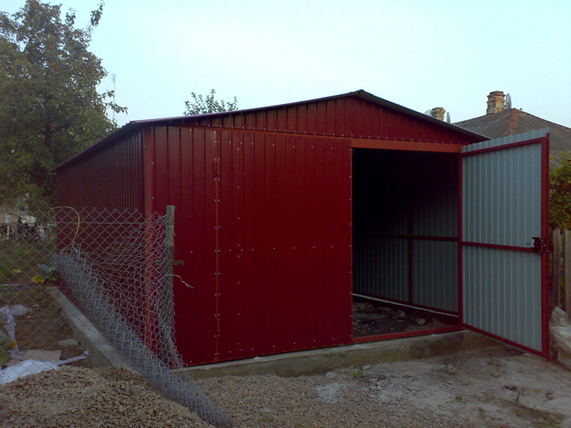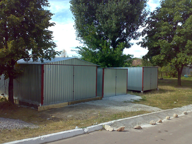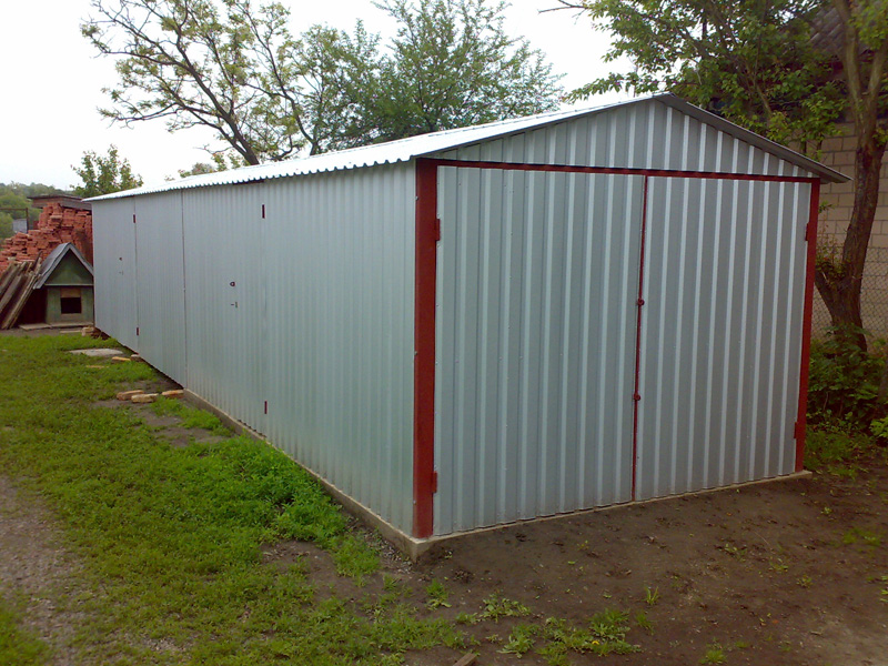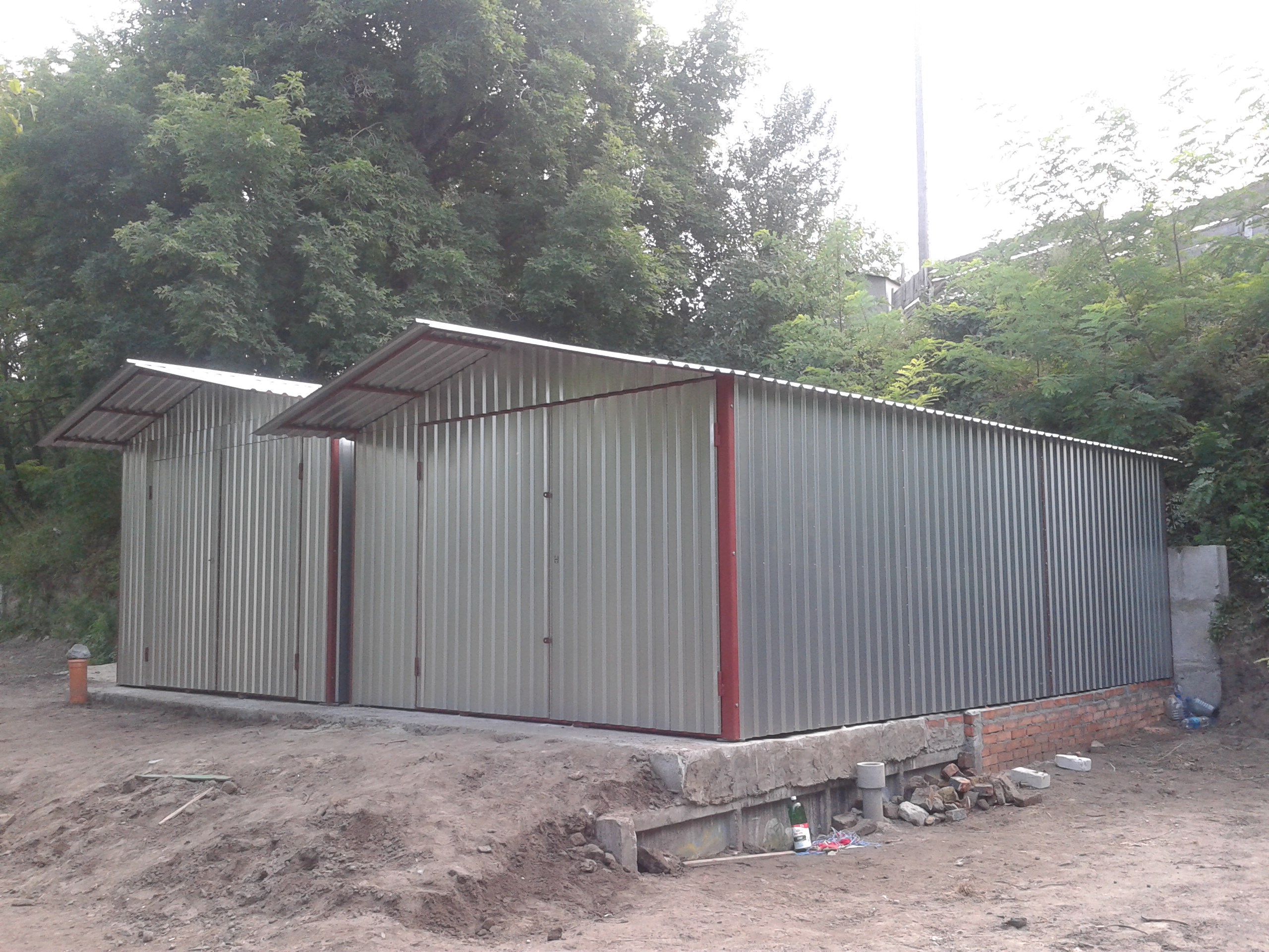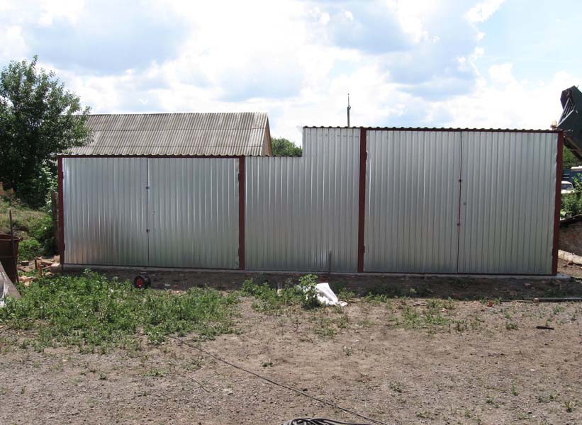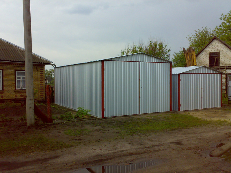 Пропонуємо Вашій увазі металеві гаражі. Каркас гаража виготовлений із квадратних і прямокутних труб 40 × 20 і 30 × 30, рама воріт виготовлена із швелера 100 × 50 × 3, що надає конструкції гаража додаткову жорсткість і виключає перекіс стулок воріт у майбутньому. Воротні стулки кріпляться до рами за допомогою воротних петель 22 × 120 з кулькою. Для даху використовуються квадратні труби 40 × 40.